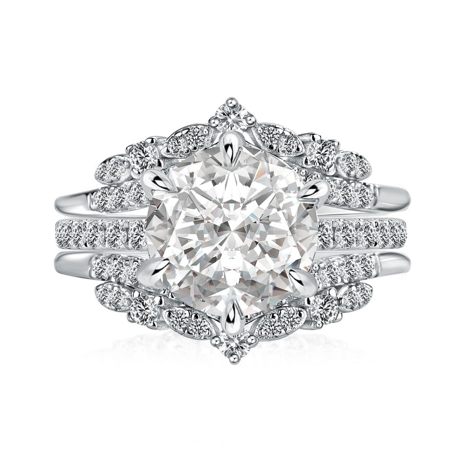 Crafted with meticulous precision, the centerpiece features a stunning 3.0-carat round-cut moissanite, known for its brilliant sparkle and fire. The round cutâcelebrated for its symmetrical perfectionâcaptures light from every angle, ensuring your ring shines with breathtaking brilliance. The claw setting enhances this radiance, elevating the stone to maximize its luminosity. Complementing this focal point is a sleek jacket wedding band, meticulously designed to embrace the main ring with grace and harmony. The platinum-plated 925 sterling silver, finished in lustrous 18K white gold, creates a polished and sophisticated look, perfect for those who adore understated elegance.
