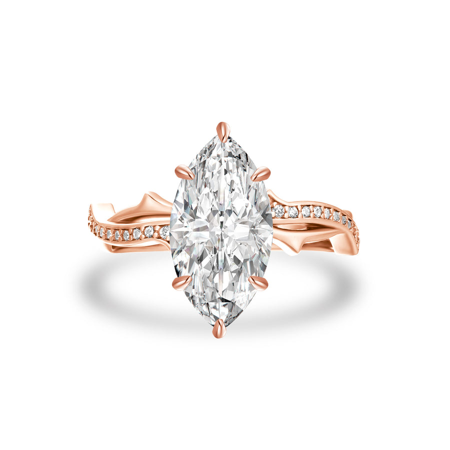 This engagement ring celebrates modern romance with a bold yet graceful silhouette. At its center, a 3.0Ct marquise-cut moissanite—securely held in a classic claw setting—commands attention with elongated brilliance, symbolizing timeless elegance. The sculptural twisted band wraps the center stone, introducing fluid movement and organic charm while framing the marquise’s pointed ends. Finished in warm 18K rose gold plating over sterling silver, the design balances contemporary artistry with classic femininity—perfect for someone who wants a distinctive, wearable statement.