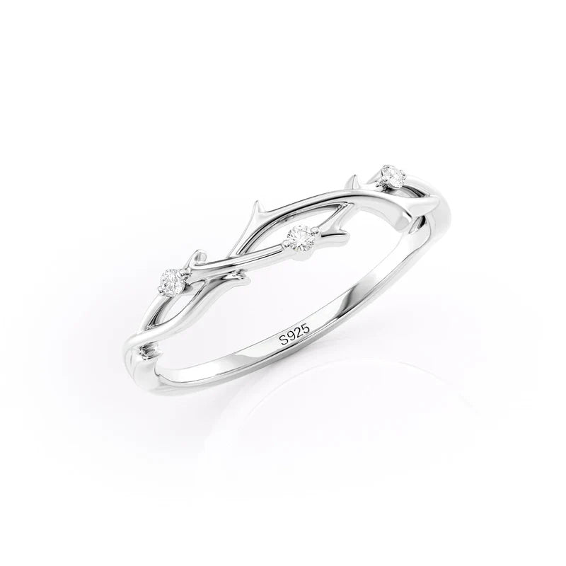 Moissanite Twig Round Cut White Gold Travel Ring In Sterling Silver
