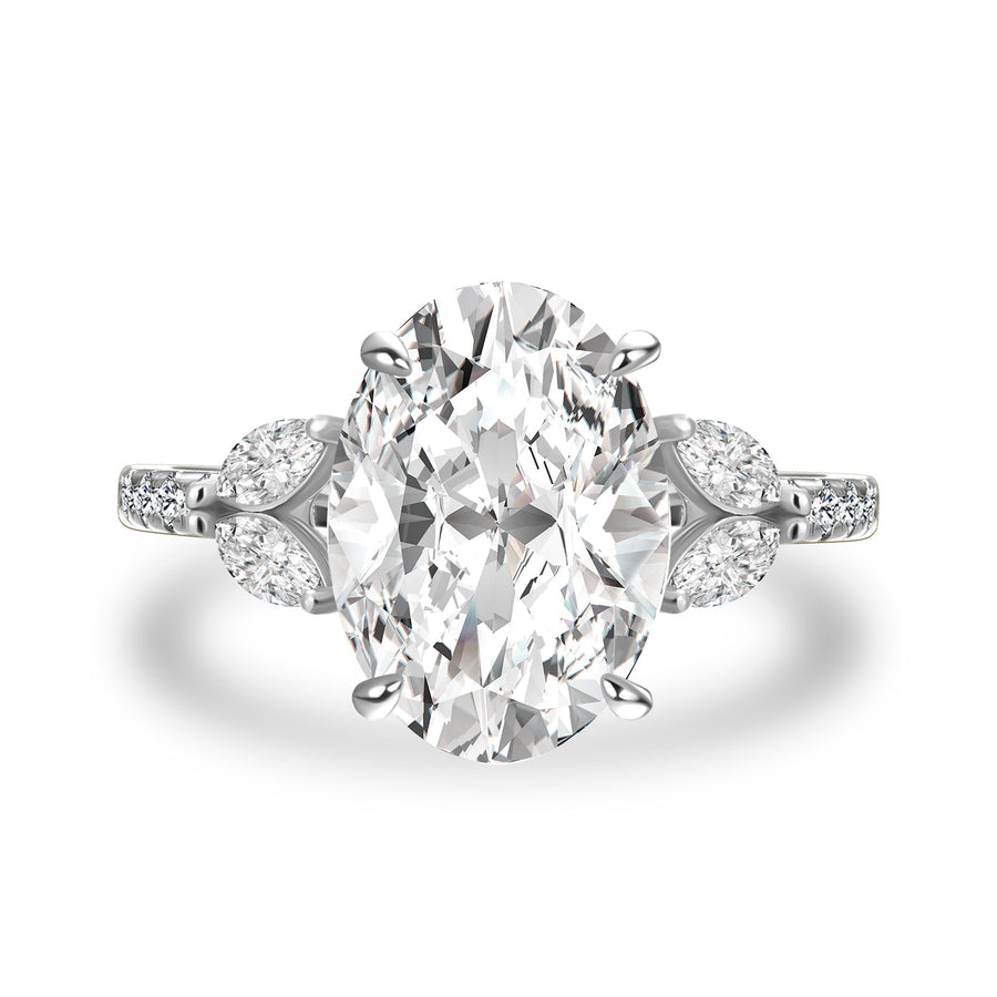 The Rodiffy 4.0Ct oval and angled marquise five-stone engagement ring is inspired by “harmonious elegance and dynamic brilliance.” The central 8x12mm oval moissanite is flanked by angled marquise-cut stones, creating a cascading effect that enhances the ring’s sparkle from every perspective. The precise claw setting elevates each stone, highlighting the excellent cut and VVS1 clarity of the moissanites.